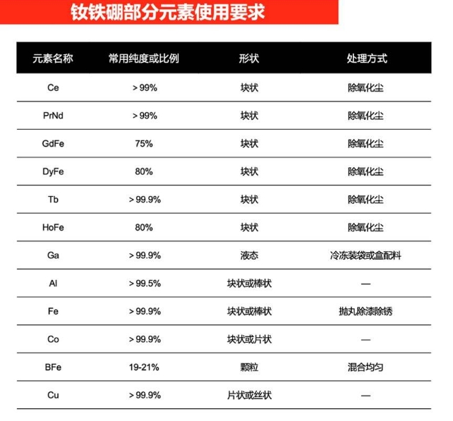 以上为常用原材料典型参考值,实际原材料厂商在生产过程中由于采用不同工艺路线往往会出现一定的偏差,如PrNd中二者的比例会从20:80变化至25:75,GdFe会出现小于75%,不同批次BFe中B含量会出现较大波动等现象,这就要求我们在使用过程中要结合每一批次质检单实际含量进行配比使用。