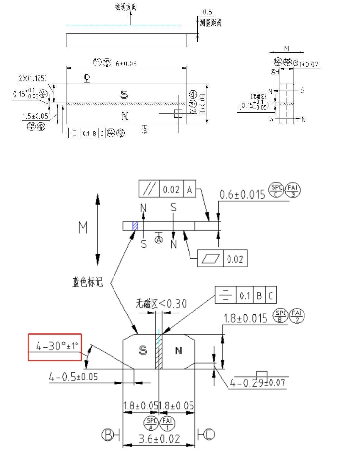 描述采购需求时,磁体的基本形状和尺寸要求是必须明确的,例如6.0mm(+0.03/-0.03),对于简单产品而言提供基本的长宽高尺寸及公差;对于形状复杂的磁体而言,轮廓度及其他角度要求(类似于下图中的红色标注30°±1°)需要提供的更为清楚,建议给供应商提供明确的图纸。